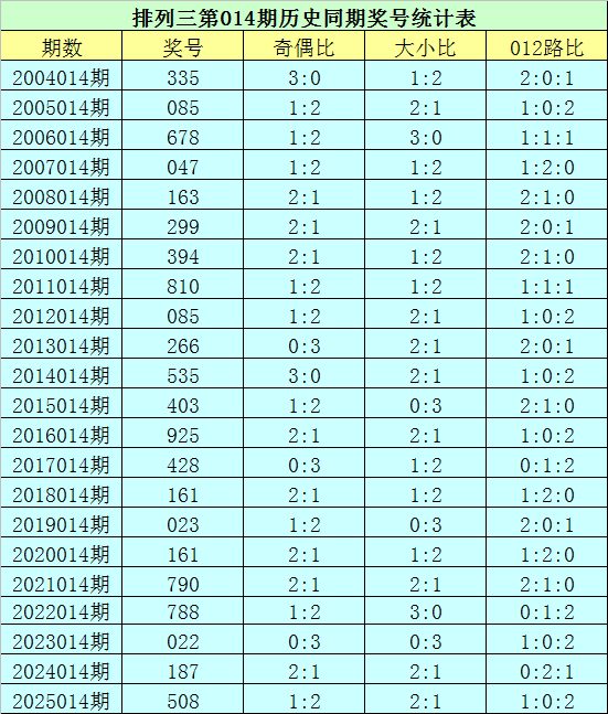 排列三第2026014期开奖日期:2026年1月14日,历史上第014期已开出了22次奖号,历年同期号码分别为:335、085、678、047、163、299、394、810、085、266、535、403、925、428、161、023、161、790、788、022、187、508。