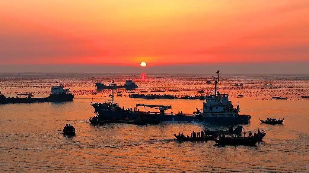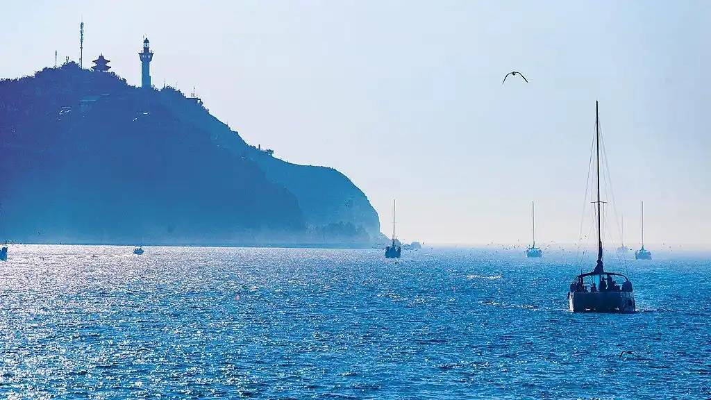 荣成青鱼滩海域,渔民披着朝霞从福建转运回的大型运输船卸载鲍鱼苗。图片来源:视觉中国威海荣成三面环海,位于山东半岛最东端。成山头三面环海,悬崖峭壁巍峨,海上日出震撼人心,被誉为“中国的好望角”;烟墩角冬季有大天鹅栖息,白羽翻飞,渔村宁静而灵动,成为摄影爱好者的天堂;百年海草房错落于海边村落,石墙草顶,藏着渔家童话。布鲁威斯号沉船遗址成为独特打卡地,沧海孤船尽显苍茫意境。各类海鲜新鲜肥美,鲅鱼水饺、清蒸扇贝、辣炒蛤蜊,每一口都是大海的馈赠。蓬莱:不是只有传说,一座可登阁望海的山海奇境
