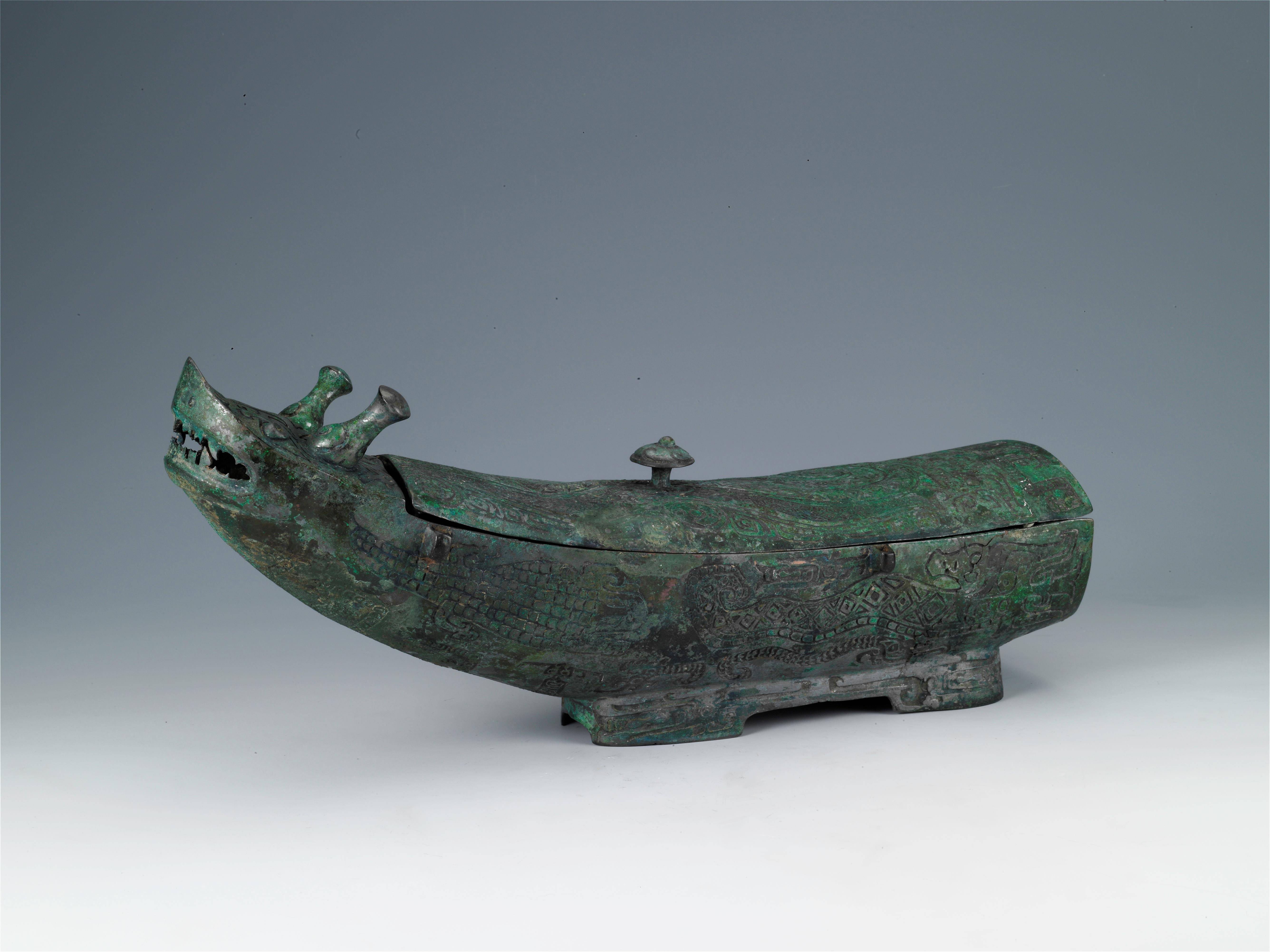r形似龙舟可载酒的商晚期青铜酒器——龙形觥,身上还有特别的鳄鱼纹。