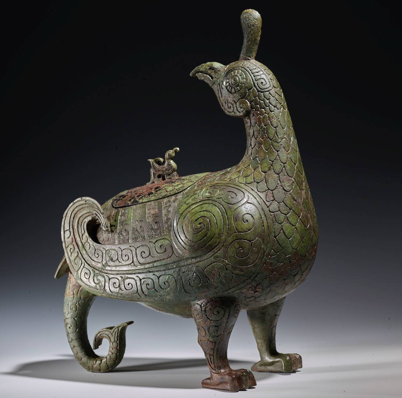 rr山西博物院镇馆之宝——晋侯鸟尊,盖子和腹部底部铸有铭文。